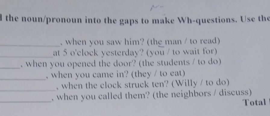 Past Continuous. 1. What 2. Who 3. What 4. What 5. What 6. What when you saw hir at 5 o'clock yesterda when you opened the doors when you came in? ( when the clock str when you called the