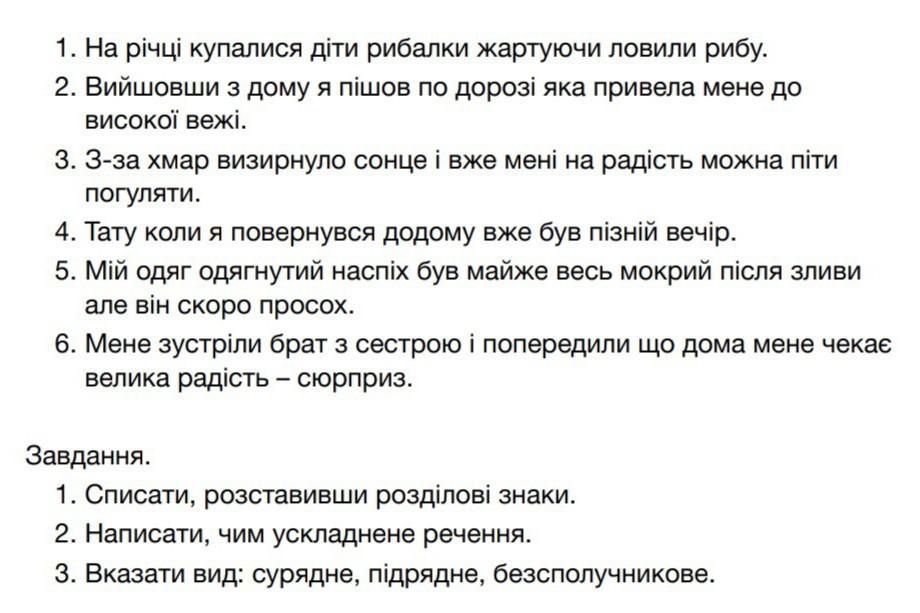2. Написати, чим ускладнене речення. 3. Вказати вид: сурядне, підрядне, безсполучникове.