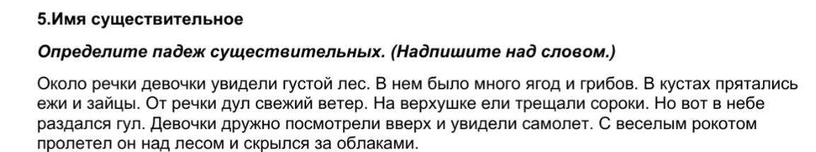 (Около чего?) около речки (П.п.) (кто?) девочки (И.п.) увидели густой (что?) лес (В.п.). В нём было много (чего?) ягод (Р.п.) и грибов (Р.п.). (В чём?) В кустах (П.п.) прятались (кто?) ежи (И.п.) и зайцы (И.п.). (От чего?) От речки (Р.п.) дул свежей (что?) ветер (И.п.). (На чём?) На верхушке (П.п.) (чего?) ели (Р.п.) трещали (кто?) сороки (И.п.). Ну вот (в чём?) в небе (П.п.) раздался (что?) гул (И.п.). (Кто?) Девочки (И.п.) дружно посмотрели вверх и увидели (что?) самолёт (В.п.). (С чем?) С весёлым рокотом (Т.п.) пролетел он (над чем?) над лесом (Т.п.) и скрылся (за чем?) за облаками (Т.п.).