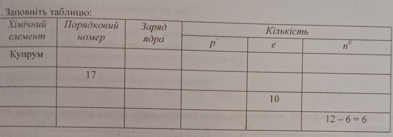 Заповніть таблицю: Хімічний Порядковий елемент номер купрум 17 Заряд ядра р Кількість е 10 n 12-6=6