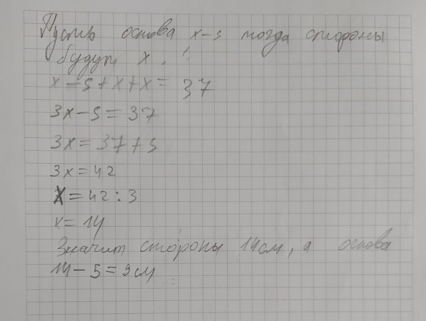 2. Периметр равнобедренного треугольника равен 37 см. основание меньше боковой стороны на 5 см.
