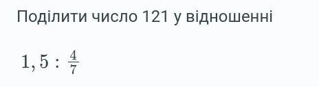 Щоб поділити число 121 у відношенні 1,5:4/7, треба знайти суму часток, які відповідають цим відношенням: