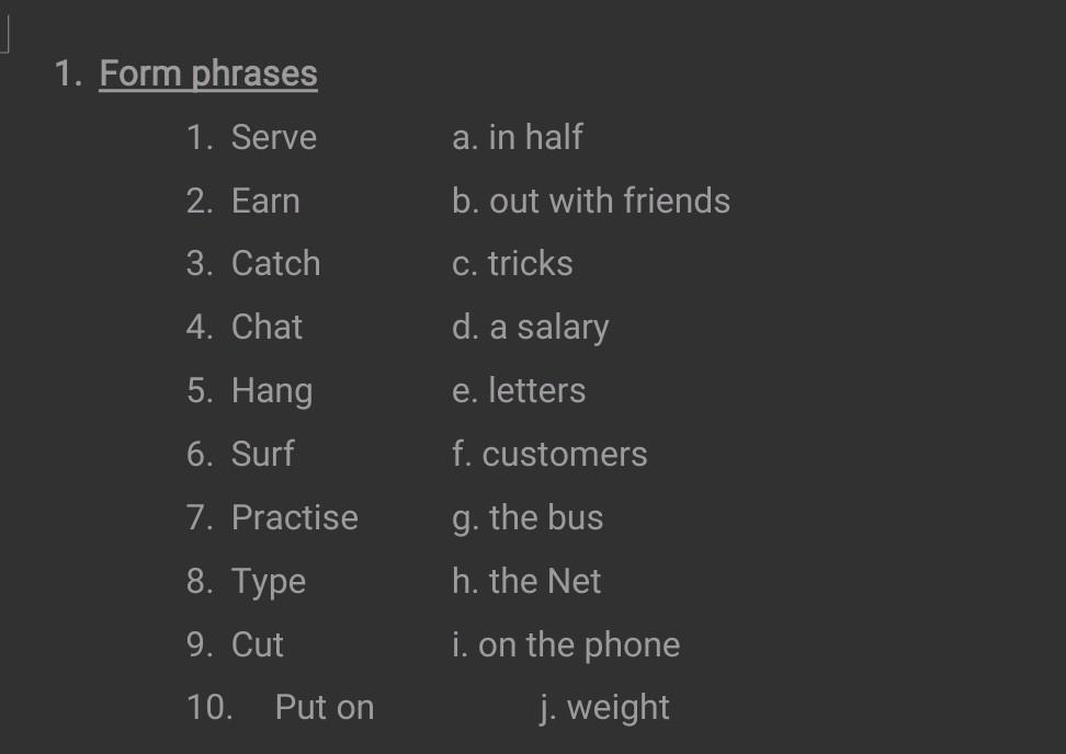 1. Form phrases 1. Serve 2. Earn 3. Catch 4. Chat 5. Hang 6. Surf 7. Practise 8. Type 9. Cut 10. Put on a. in half b. out with friends c. tricks d. a salary e. letters f. customers g. the bus h. the Net i. on the phone j. weight