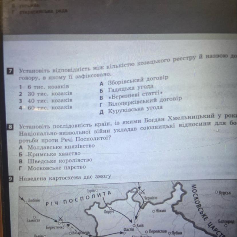 3 Установіть послідовність країн, із якими Богдан Хмельницький у роки Національно-визвольної війни укладав союзницькі відносини для бо- ротьби проти Речі Посполитої? А Молдавське князівство Б Кримське ханство В Шведське королівство Г Московське царство