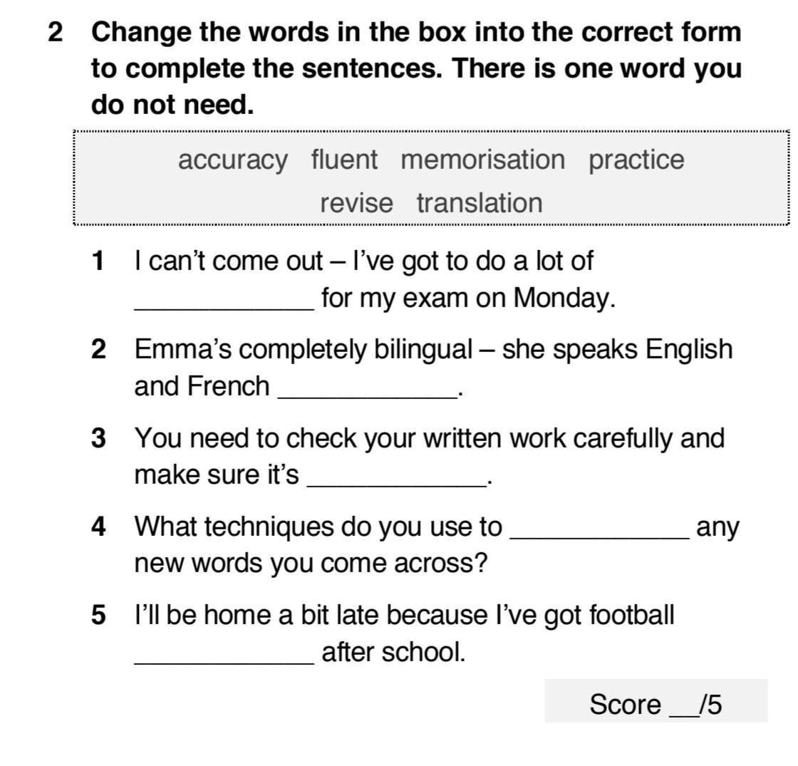 2 Change the words in the box into the correct form to complete the sentences. There is one word you do not need. accuracy fluent memorisation practice revise translation 1 I can't come out - I've got to do a lot of for my exam on Monday. 2 Emma's completely bilingual - she speaks English and French 3 You need to check your written work carefully and make sure it's 4 What techniques do you use to new words you come across? 5 I'll be home a bit late because I've got football after school. any Score /5