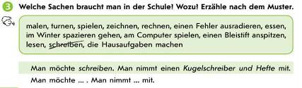 Man möchte malen. Man nimmt Farben und Pinsel mit. Man möchte turnen. Man nimmt Sportkleidung und Sportschuhe mit. Man möchte spielen. Man nimmt Spielzeug oder Spiele mit. Man möchte zeichnen. Man nimmt Papier und Stifte mit. Man möchte rechnen. Man nimmt einen Taschenrechner und Schulbücher mit. Man möchte einen Fehler ausradieren. Man nimmt einen Radiergummi mit. Man möchte essen. Man nimmt eine Lunchbox mit. Im Winter möchte man spazieren gehen. Man nimmt warme Kleidung und Stiefel mit. Man möchte am Computer spielen. Man nimmt einen Laptop mit. Man möchte einen Bleistift anspitzen. Man nimmt einen Anspitzer mit. Man möchte lesen. Man nimmt Bücher mit. Man möchte schreiben. Man nimmt einen Kugelschreiber und Hefte mit.