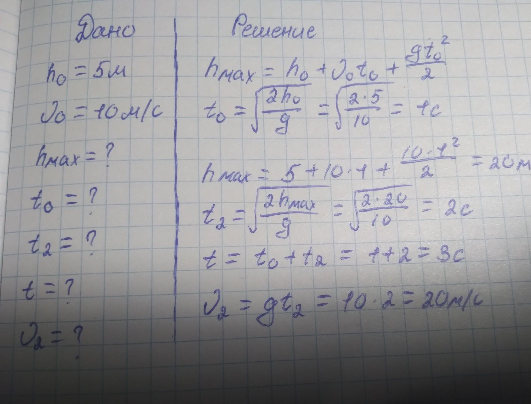 Тело брошено вверх со скоростью 10 м/с с высоты 5 м (g = 10 м/с²). Вычислите: максимальную высоту подъема; время подъема; время падения; время движения; скорость, с которой тело достигнет земли.