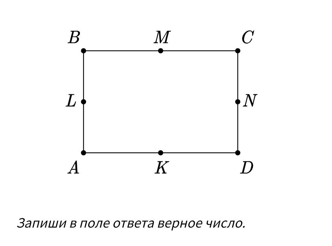 На рисунке изображён прямоугольник ABCD . Точки K, L, M, N-середины его сторон. Найди вероятность, что случайно выбранная точка в прямоугольнике будет принадлежать четырёхугольнику AMCK.