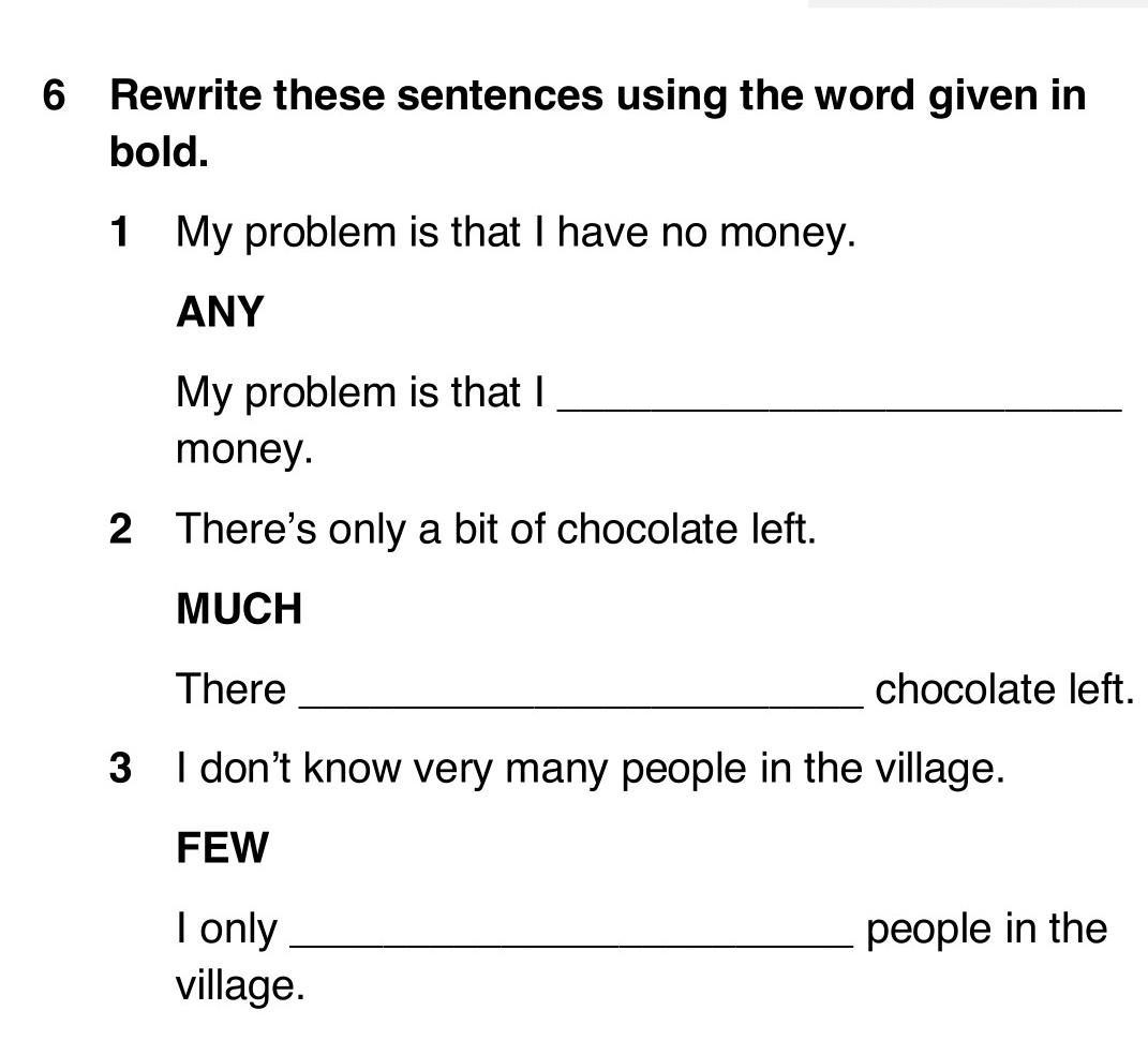 6 Rewrite these sentences using the word given in bold. 1 My problem is that I have no money. ANY My problem is that I money. 2 There's only a bit of chocolate left. MUCH There 3 I don't know very many people in the village. FEW I only village. chocolate left_ people in the