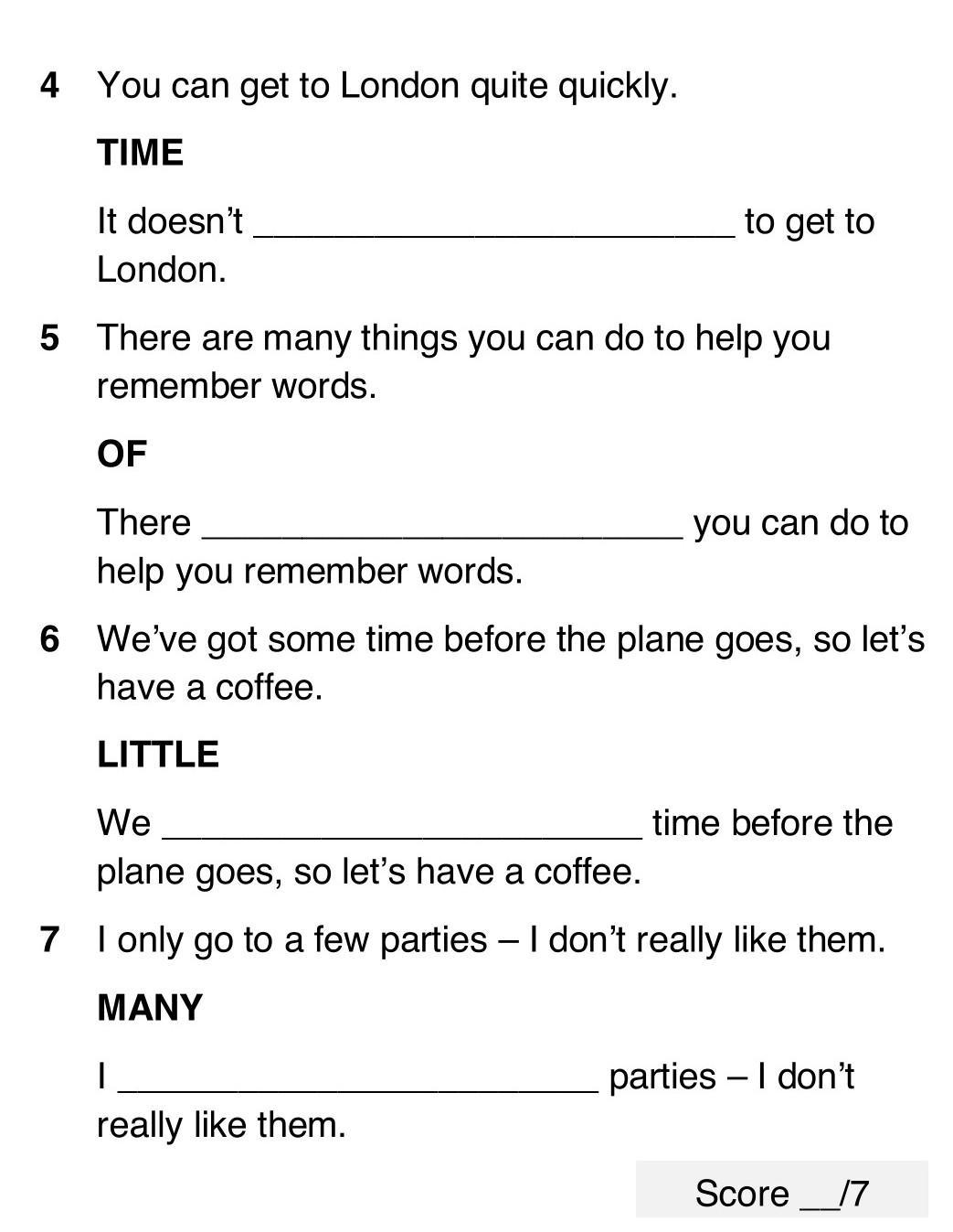 4 You can get to London quite quickly. TIME It doesn't London. 5 There are many things you can do to help you remember words. OF There help you remember words. to get to you can do to 6 We've got some time before the plane goes, so let's have a coffee. LITTLE 1 really like them. We plane goes, so let's have a coffee. 7 I only go to a few parties - I don't really like them. MANY time before the parties - I don't Score/7