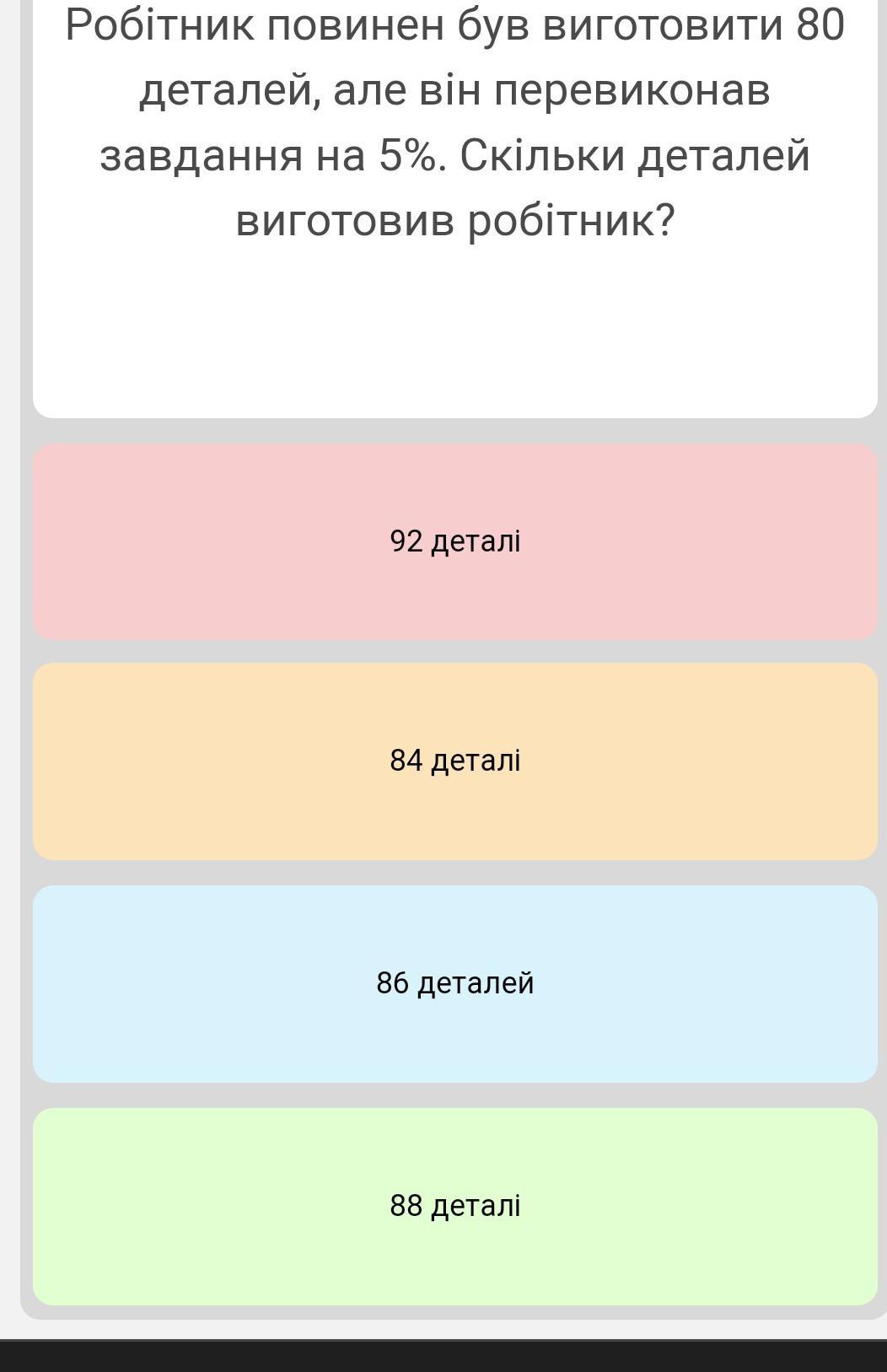 Робітник виготовив 84 деталі, оскільки він перевиконав завдання на 5%, тобто 100% + 5% = 105%, що є 80 деталями * 1,05 = 84 деталі. Отже, правильний варіант - 84 деталі.