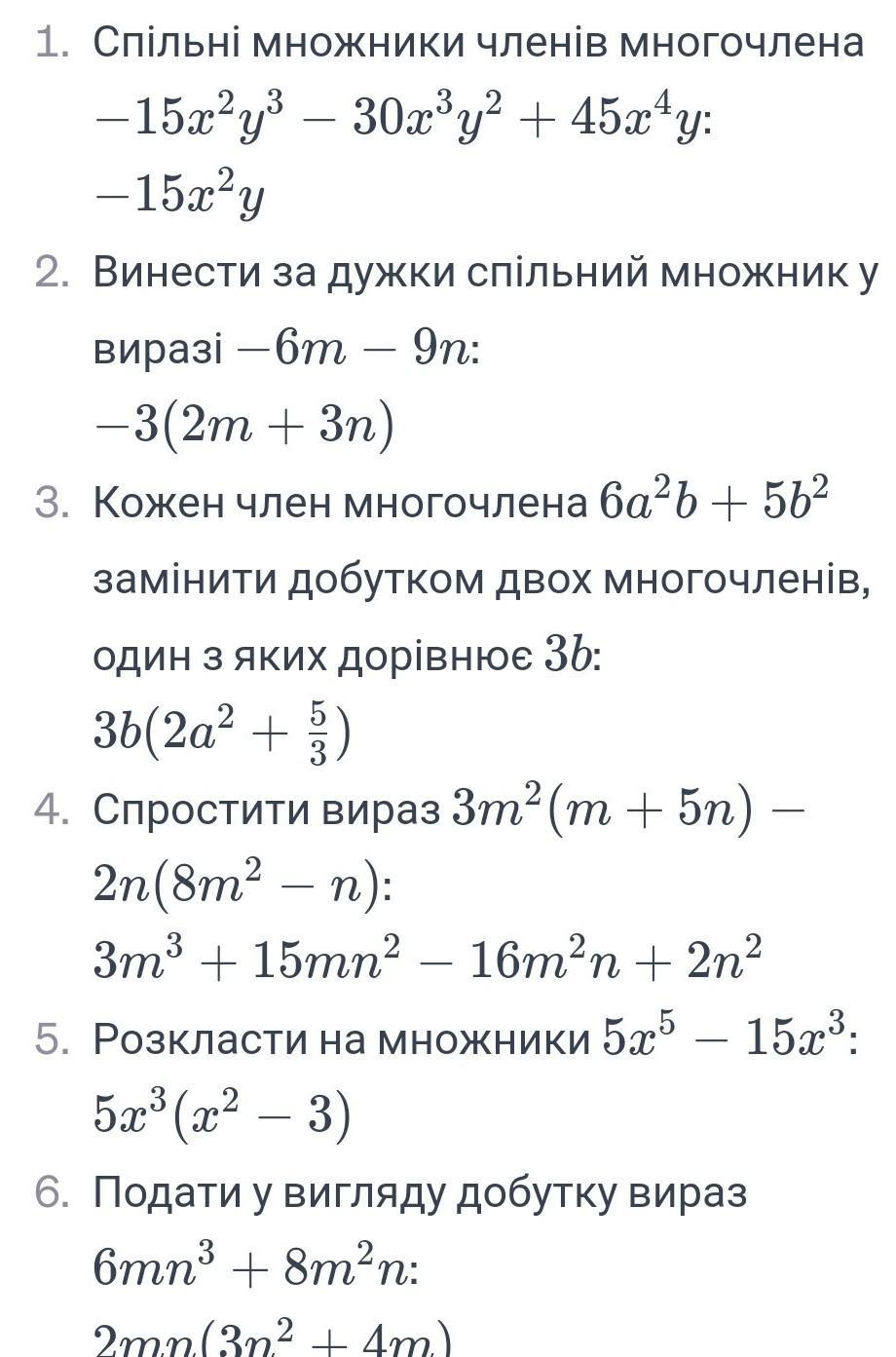 Записати спільні множники членів многочлена -15х²у³-30х³у2+45х⁴у