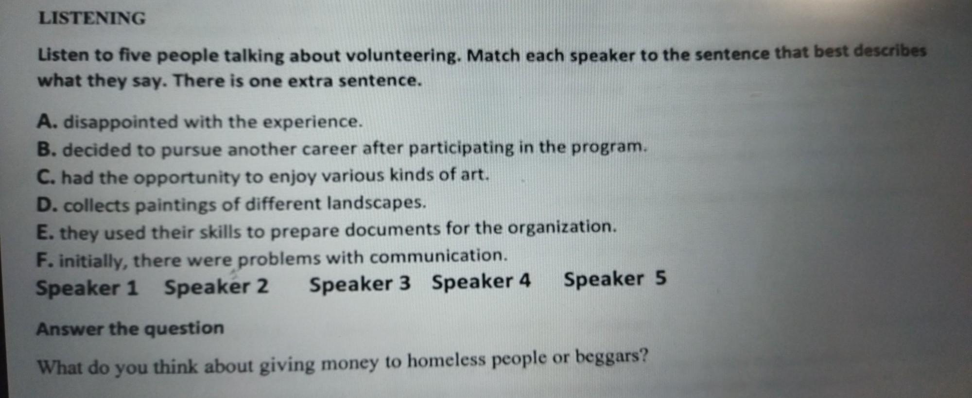 Listen to five people talking about volunteering. Match each speaker to the sentence that best describes what they say. There is one extra sentence. A. disappointed with the experience. B. decided to pursue another career after participating in the program. C. had the opportunity to enjoy various kinds of art. D. collects paintings of different landscapes. E. they used their skills to prepare documents for the organization. F. initially, there were problems with communication. Speaker 1 Speaker 2 Speaker 3 Speaker 4 Speaker 5 Answer the question What do you think about giving money to homeless people or beggars?