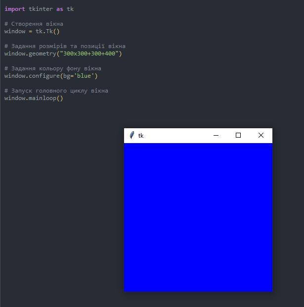 Створіть проект виконання якого відкриє вікно синього кольору з розмірами 300*300 пікселів,ліва межа якого розміщено на відстані 300 пікселів від лівої межі екрана і верхня межа якого знаходиться на відстані 400 пікселів від верхньої межі екрана