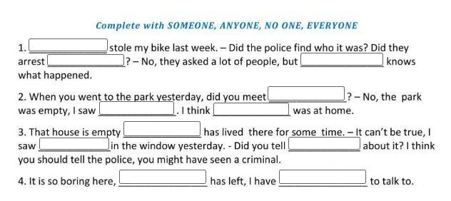 1 someone 2 anyone 3 no one, 4 anyone, 5 no one, 6 everyone, 7 no one, 8 someone, 9 anyone, 10 everyone, 11 no one