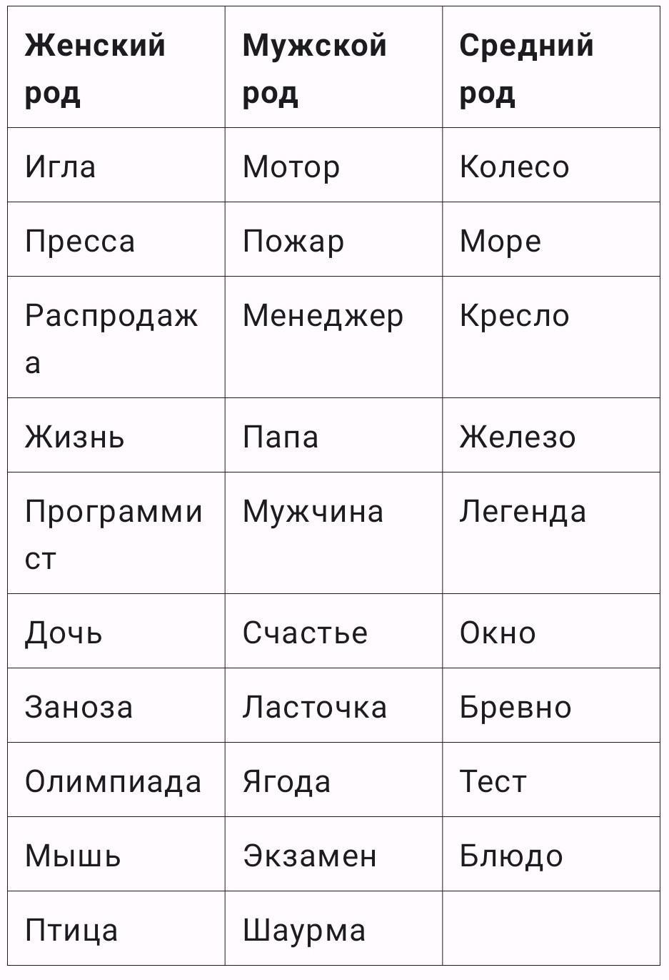 1. Определите род приведённых ниже существительных. Запишите их в три столбика.