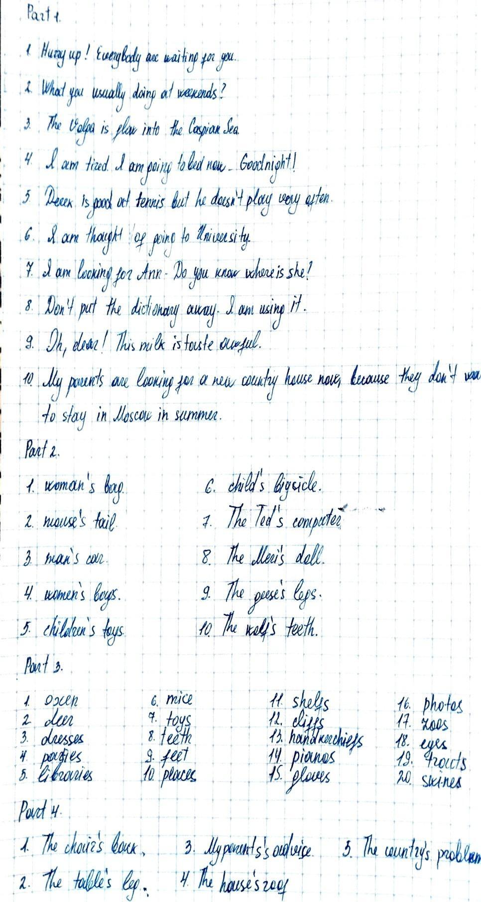 Part 4. 1. The chair's back. 2. The table's leg. 3. My parents' advice. 4. The house's roof. 5. The country's problems.