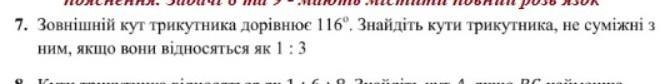 Також нам дано, що зовнішній кут трикутника дорівнює \( 116^{\circ} \). Зовнішній кут трикутника є сумою двох несуміжних внутрішніх кутів. Тому ми можемо записати рівняння: