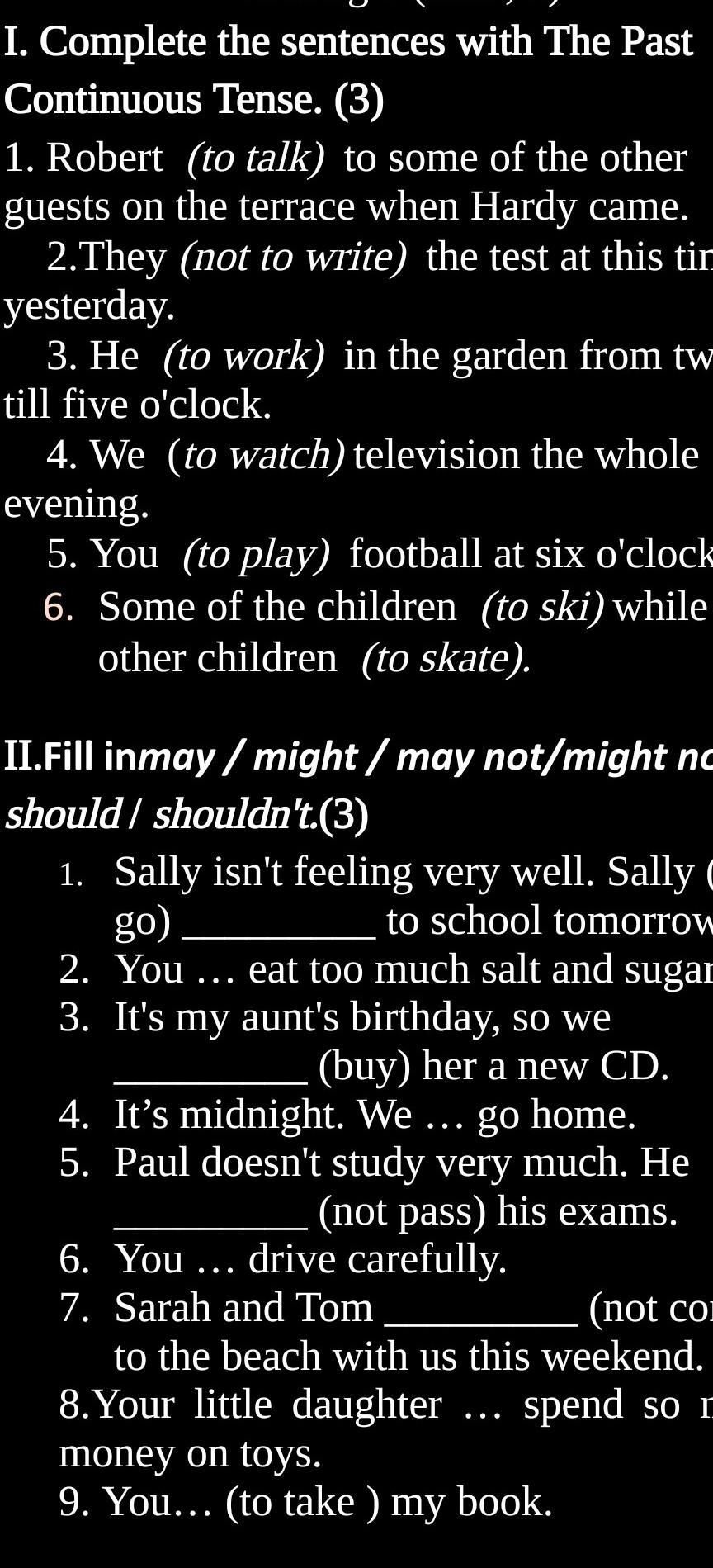 1. Complete Continuous the sentences with The Past Tense. (3) 1. Robert (to talk) to some of the other guests on the terrace when Hardy came. 2.They (not to write) the test at this time yesterday. 3. He (to work) in the garden from two till five o'clock. 4. We (to watch) television the whole evening. 5. You (to play) football at six o'clock? 6. Some of the children (to ski) while other children (to skate). II.Fill inmay/might / may not/might not / should / shouldn't.(3) 1. Sally isn't feeling very well. Sally (not go) to school tomorrow. 2. You... eat too much salt and sugar. 3. It's my aunt's birthday, so we (buy) her a new CD. 4. It's midnight. We ... go home. 5. Paul doesn't study very much. He (not pass) his exams. 6. You ... drive carefully. 7. Sarah and Tom (not come) to the beach with us this weekend. 8. Your little daughter ... spend so much money on toys. 9. You... (to take ) my book. III.Complete the sentences with Past Simple or Past Perfect. (3) 1.Simon ... (be) very glad to see that his brother ... (do) the homework. 2. By the time the film ... (end), she ... (fall