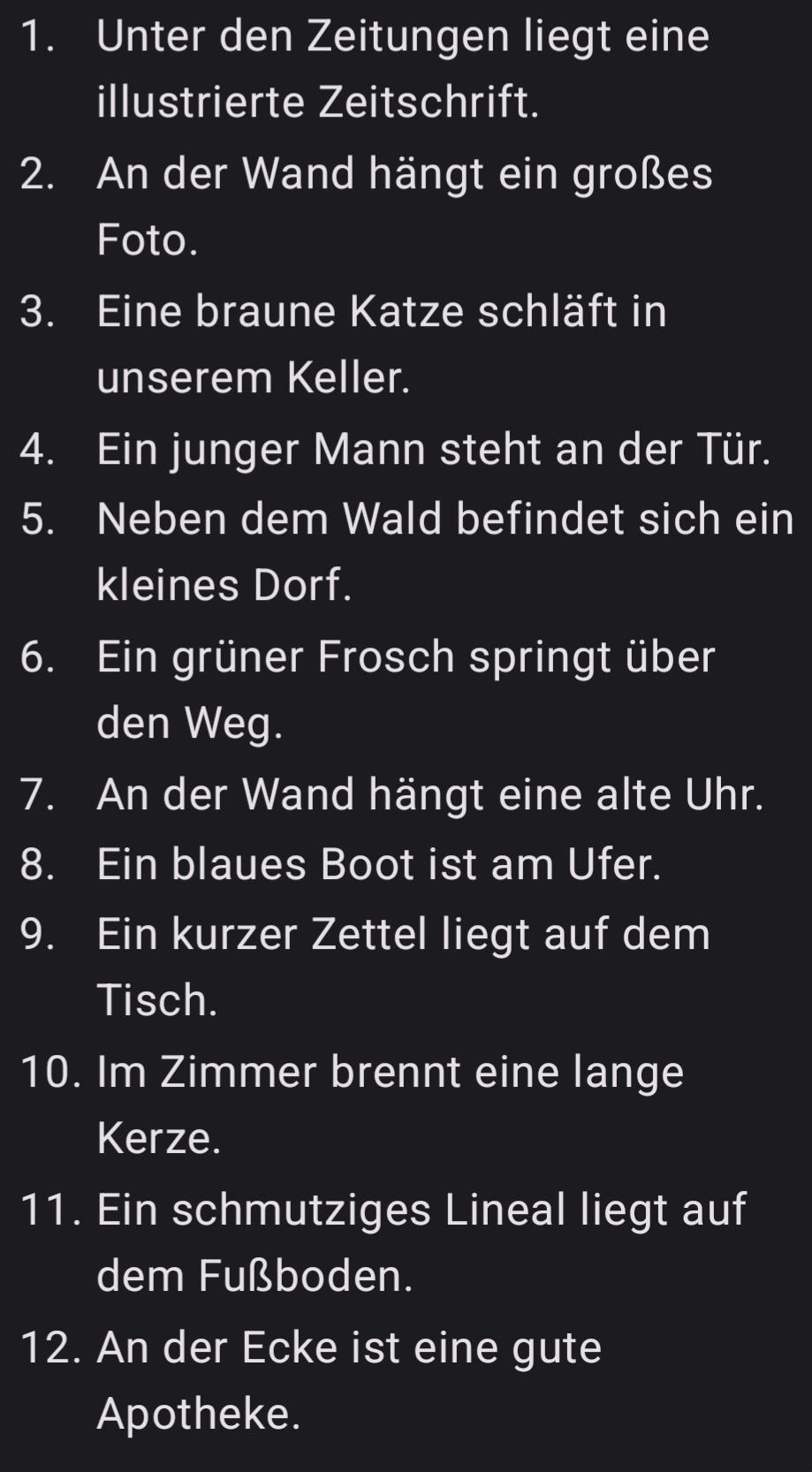 22 Напиши одним реченням. Muster: Ein Buch liegt auf dem Tisch. Es ist grün. → Ein grünes Buch liegt auf dem Tisch. 1) Unter den Zeitungen liegt eine Zeitschrift. Sie ist illustriert. 2) Ein Foto hängt an der Wand. Es ist groß. 3) Eine Katze schläft in unserem Keller. Sie ist braun. 4) Ein Mann steht an der Tür. Er ist jung. 5) Neben dem Wald befindet sich ein Dorf. Es ist klein. 6) Ein Frosch springt über den Weg. Er ist grün. 7) An der Wand hängt eine Uhr. Sie ist alt. 8) Ein Boot ist am Ufer. Es ist blau. 9) Ein Zettel liegt auf dem Tisch. Er ist kurz. 10) Im Zimmer brennt eine Kerze. Sie ist lang. 11) Ein Lineal liegt auf dem Fußboden. Es ist schmutzig. 12) An der Ecke ist eine Apotheke. Sie ist gut. die Zeitschrift illustriert das Ulfer - Das AdjektIV журнал ілюстрований honor - der Zettel die Kerze - - записка свічка
