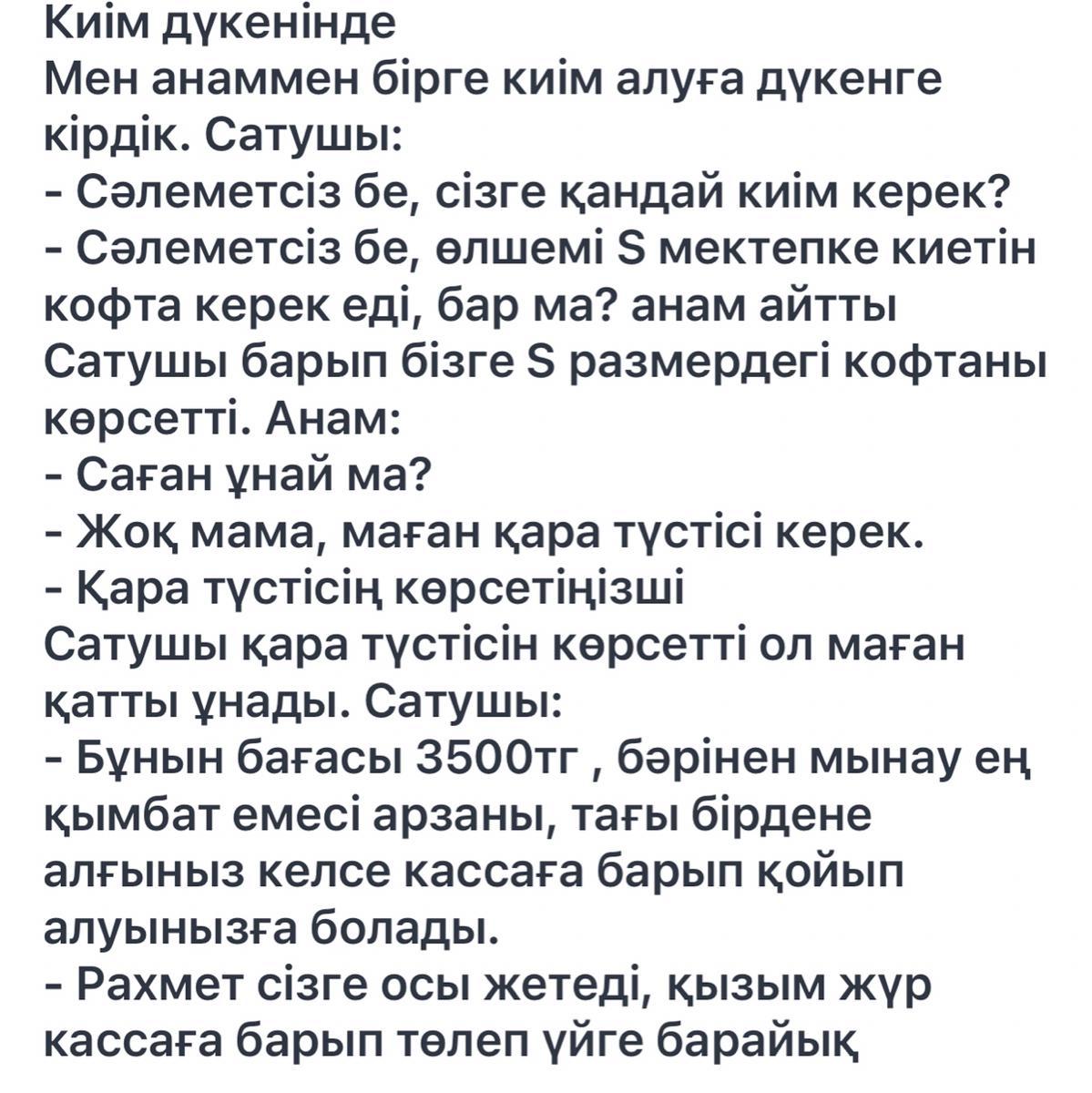 составь рассказ 5 предложений Берілген тірек сөздерді пайдаланып, «Киім дүкенінде» тақырыбында әнгімеле (5-6 сөйлем). Тірек сөздер: өлшем (размер), бар ма? (есть ли?), ұнай ма? (нравится?), керек (нужен), түс (цвет), көрсетіңізші (покажите), бағасы (цена), тенге (теңге), кымбат емес (недорого), ақшаны (деньги), төлеймін (расплачусь), кассаға (на кассе), ракмет (спасибо)
