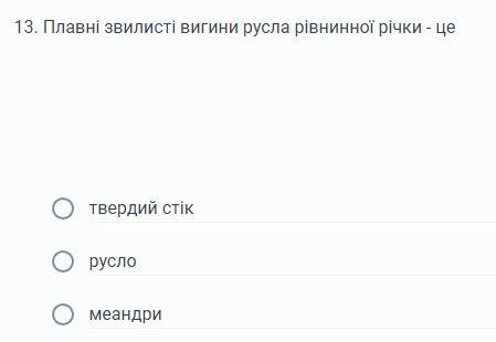 13. Плавні звилисті вигини русла рівнинної річки - це **меандри**.
