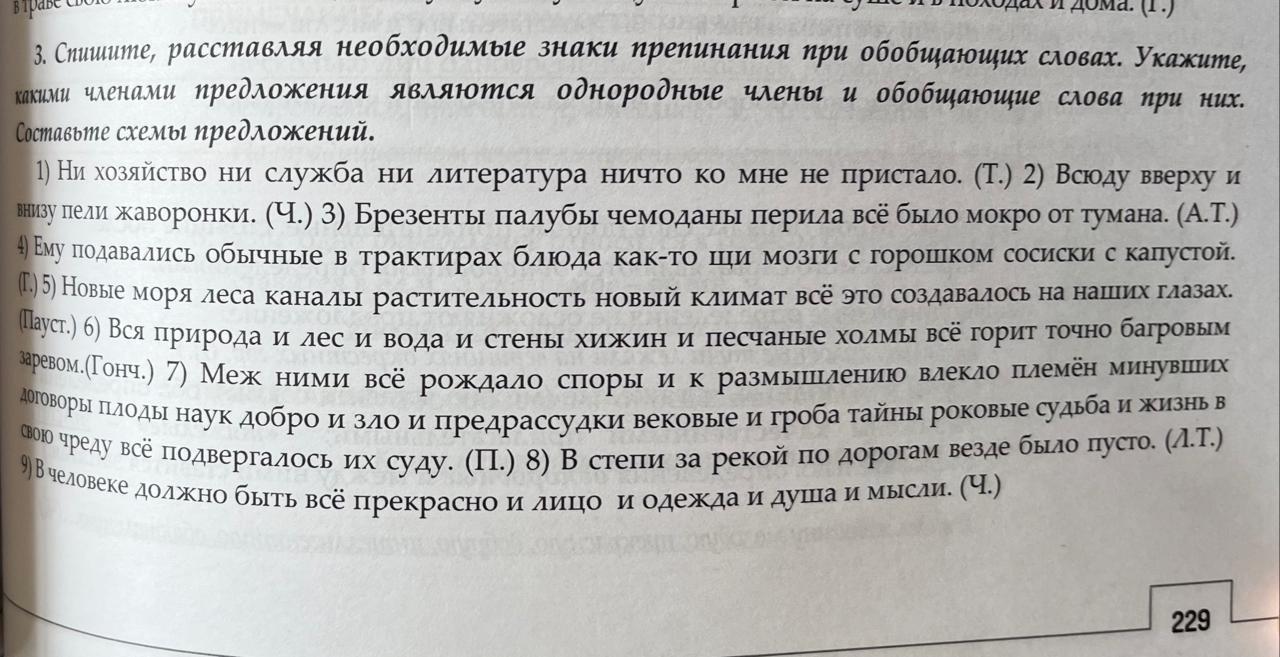 Ни хозяйство (подл.), ни служба ,(подл.) ни литература (подл.) - ничто (подл.) ко мне не пристало (сказ). Всюду: вверху и внизу пели (сказ.) жаворонки (подл.). Брезенты (подл.), палубы (подл.), чемоданы (подл.) - все (подл.) было мокро (сказ.) от тумана. Ему подавались (сказ.) обычные в трактирах блюда (подл.): как-то щи (подл.), мозги (подл.) с порошком, сосиски (подл.) с капустой. Новые моря (подл.), леса (подл.) , каналы (подл.) , растительность (подл.), новый климат (подл.) - все (подл.) это создавалось (сказ.) на наших глазах. Вся природа (подл.) : и лес (подл.), и вода (подл.), и стены (подл.) хижин, и песчаные холмы (подл.) - все (подл.) горит (сказ.) точно багровым заревом. Меж ними все (подл.) рождало (сказ.) споры и к размышлению влекло (сказ.) : племен минувших договоры (подл.); плоды (подл.) наук, добро (подл.) и зло (подл.), и предрассудки (подл.) вековые, и гроба тайны (подл.) роковые, судьба (подл.) и жизнь (подл.) в свою череду - все (подл.) подвергалось (сказ.) их суду. В степи, за рекой, по дорогам - везде было пусто (сказ.) . В человеке должно быть (сказ.) все (подл.) прекрасно (сказ.) : и лицо (подл.), и одежда (подл.) , и душа (подл.) , и мысли (подл.) .