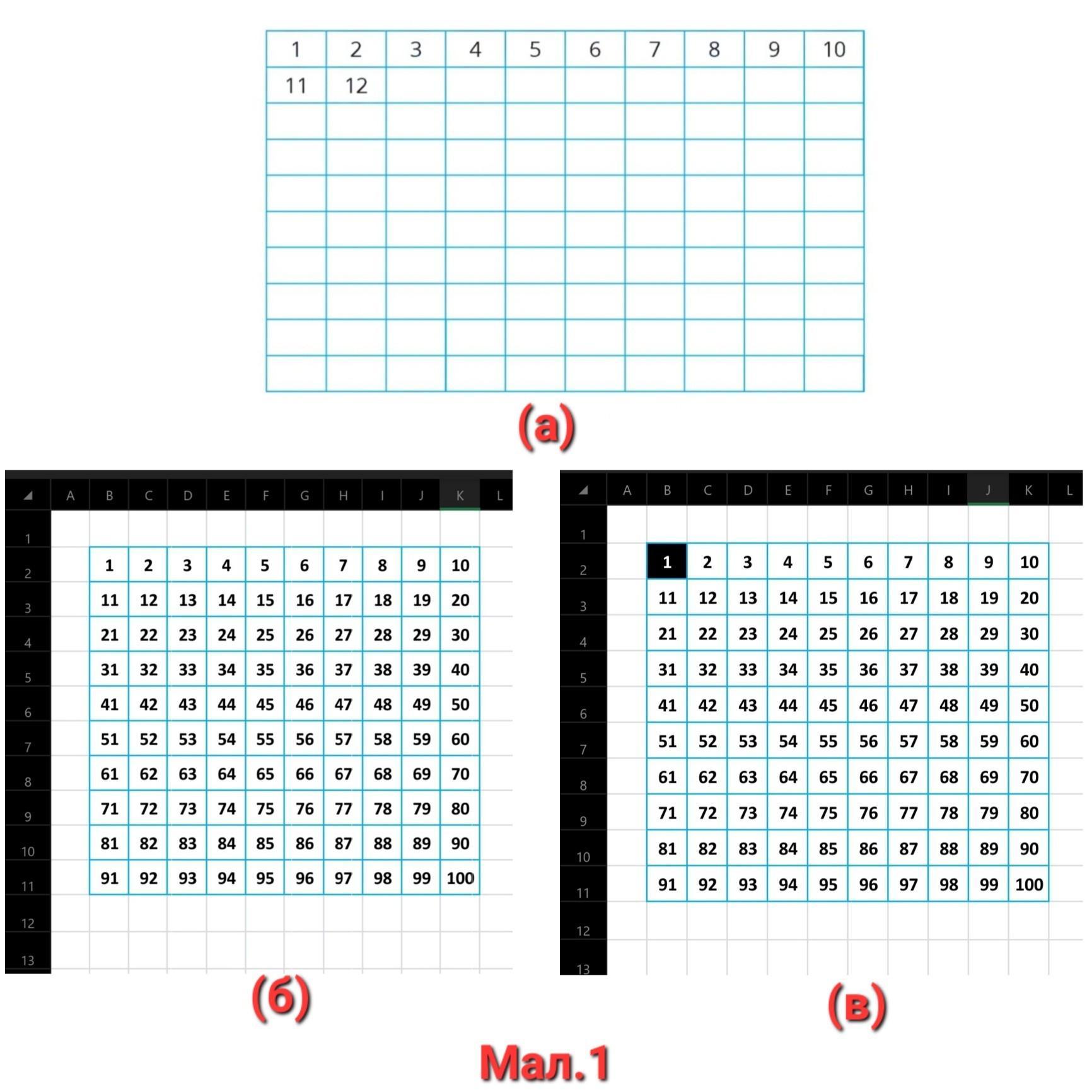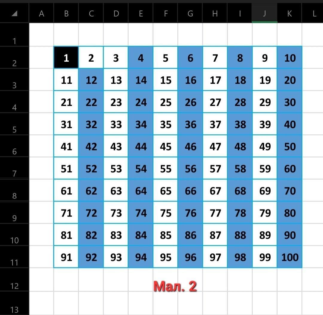1) Заповнюємо таблицю послідовними числами до 100 включно (Мал. 1б).