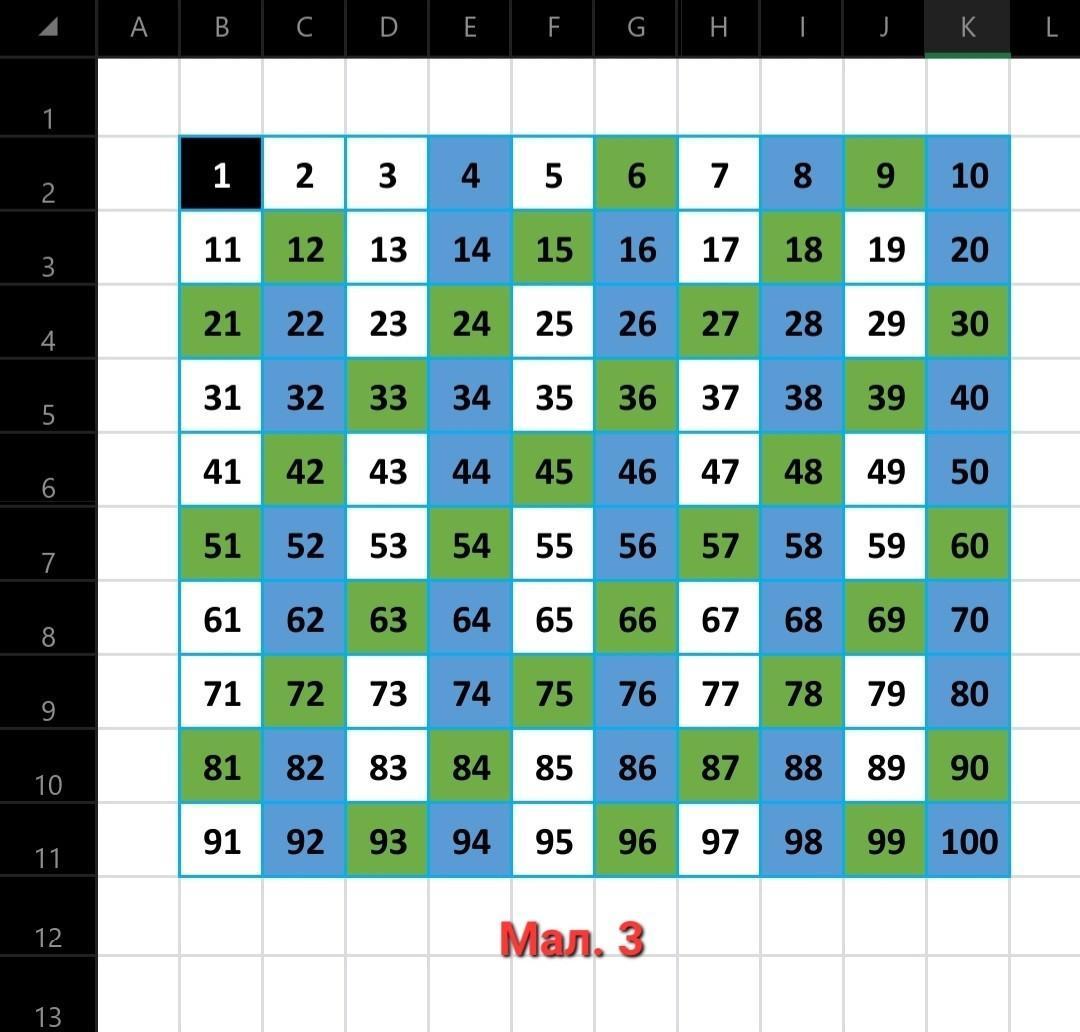 4) Зафарбовуємо зеленим кольором усі клітинки, де записані числа, кратні З (Мал. 3).