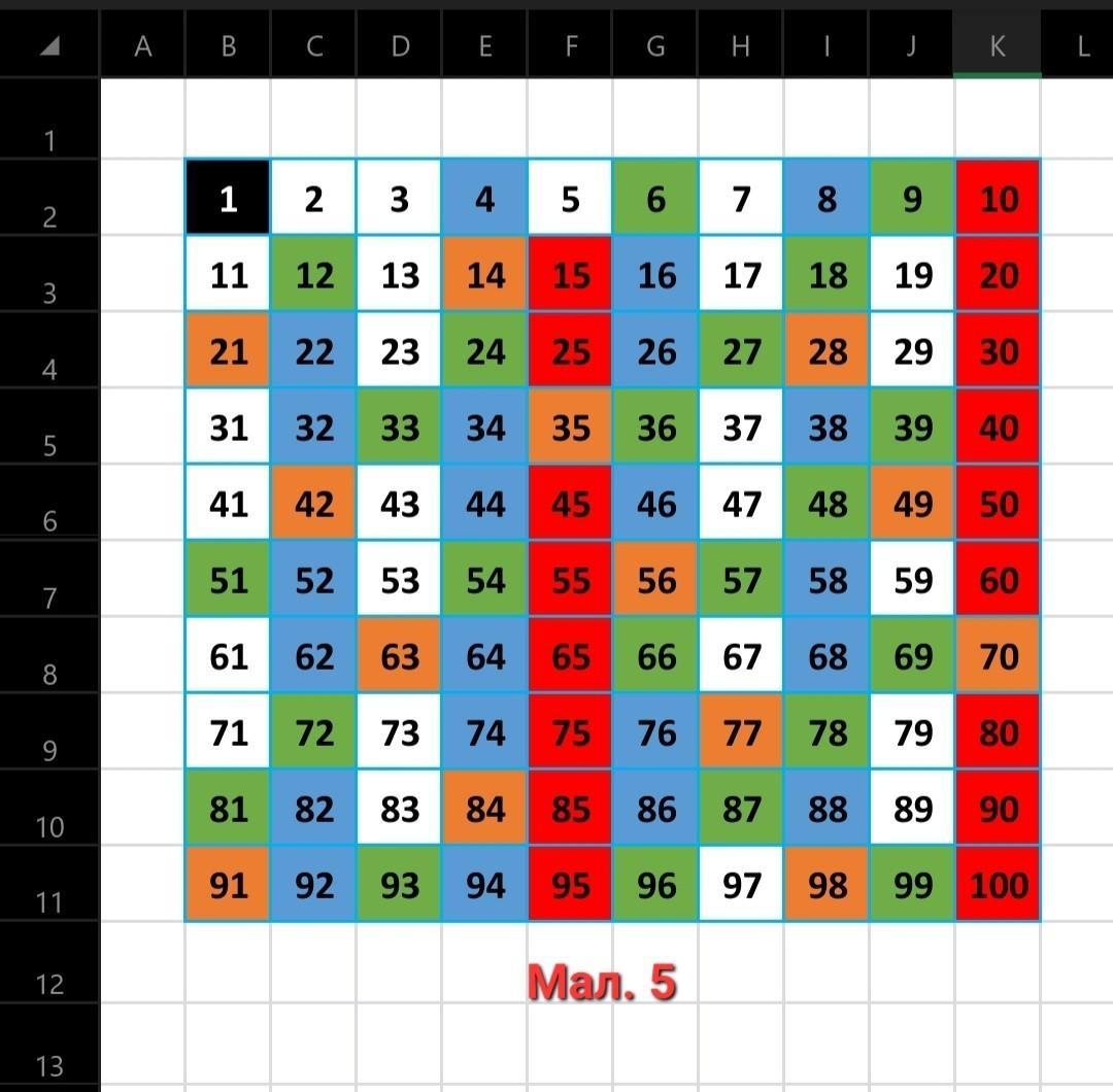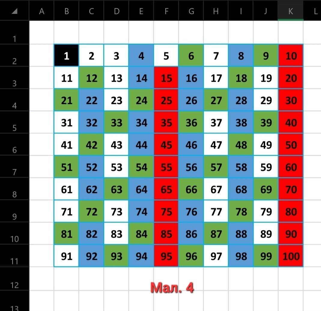 5) Зафарбовуємо червоним кольором усі клітинки, де записані числа, кратні 5 (Мал. 4).