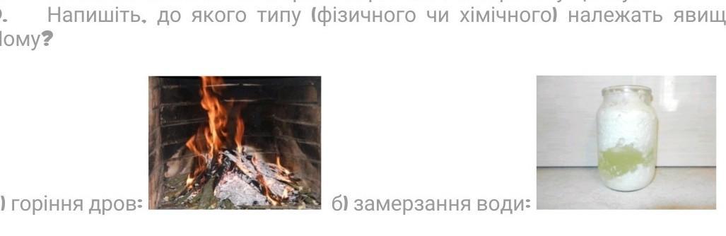 Напишіть, до якого типу (фізичного чи хімічного) належать яви Чому? a) горіння дров: б) замерзання води: