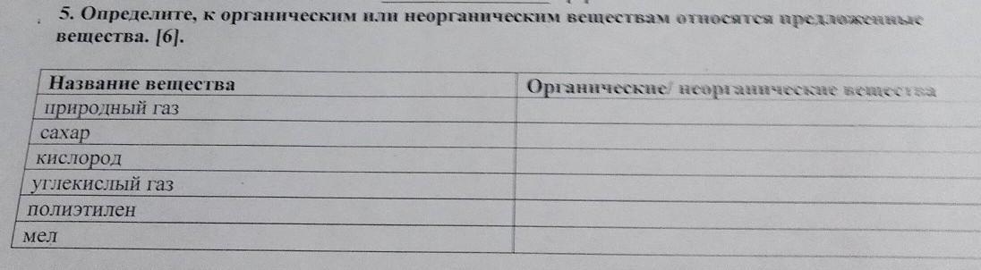 5. Определите, к органическим или неорганическим веществам относятся предложе вещества. [6]. Название вещества природный газ сахар кислород углекислый газ полиэтилен мел Органические/ неорганические вещества