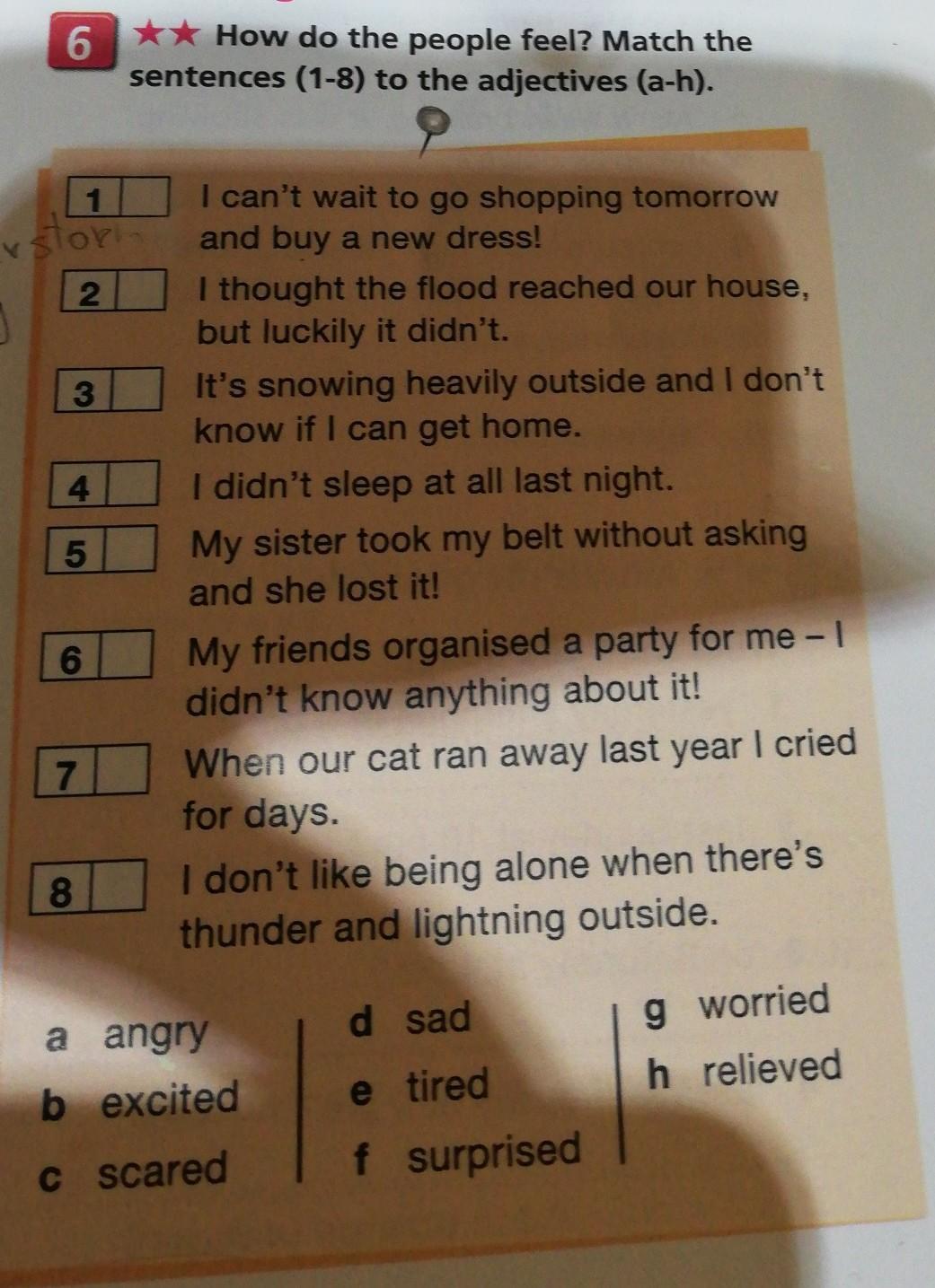 6 1 ok! 2 3 4 5 6 10 8 How do the people feel? Match the sentences (1-8) to the adjectives (a-h). I can't wait to go shopping tomorrow and buy a new dress! c I thought the flood reached our house, but luckily it didn't. It's snowing heavily outside and I don't know if I can get home. I didn't sleep at all last night. My sister took my belt without asking and she lost it! [7] When our cat ran away last year I cried for days. My friends organised a party for me - I didn't know anything about it! I don't like being alone when there's thunder and lightning outside. a angry b excited scared d sad e tired f surprised g worried h relieved