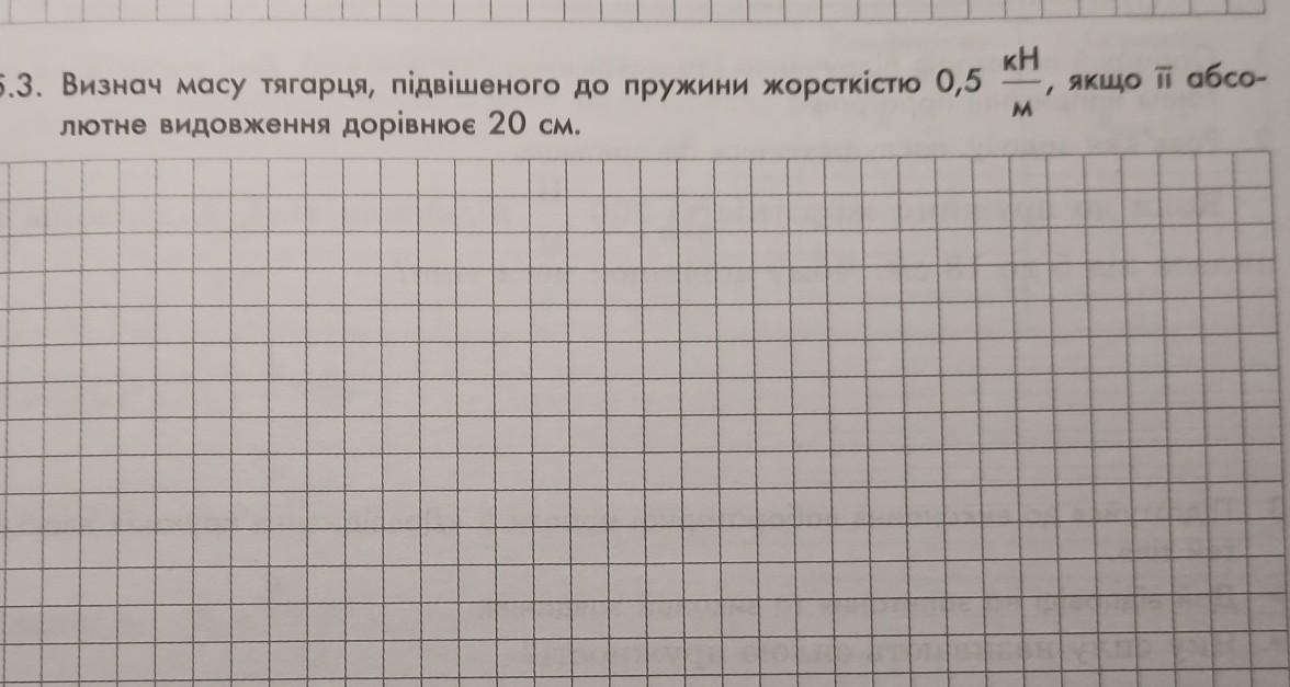 5.3. Визнач масу тягарця, підвішеного до пружини жорсткістю 0,5 кН, якщо її абсолютне видовження дорівнює 20 см.