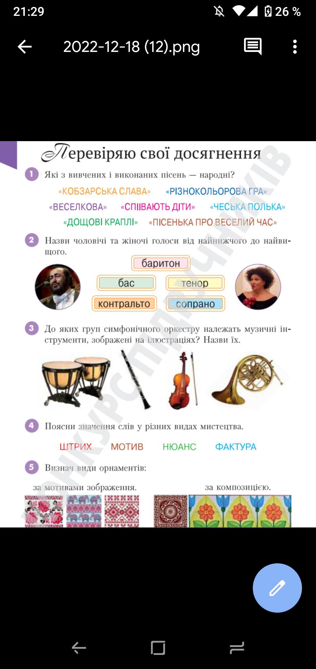 3. На иллюстрациях показаны ударный (барабан), струнный (скрипка) и духовой (валторна) инструменты.