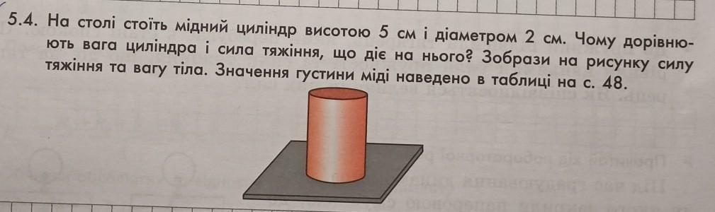 5.4. На столі стоïть мiдний циліндр висотою 5 см і діаметром 2 см. Чому дорівню- ють вага циліндра і сила тяжіння, що діє на нього? Зобрази на рисунку силу тяжіння та вагу тіла. Значення густини міді наведено в таблиці на с. 48. п
