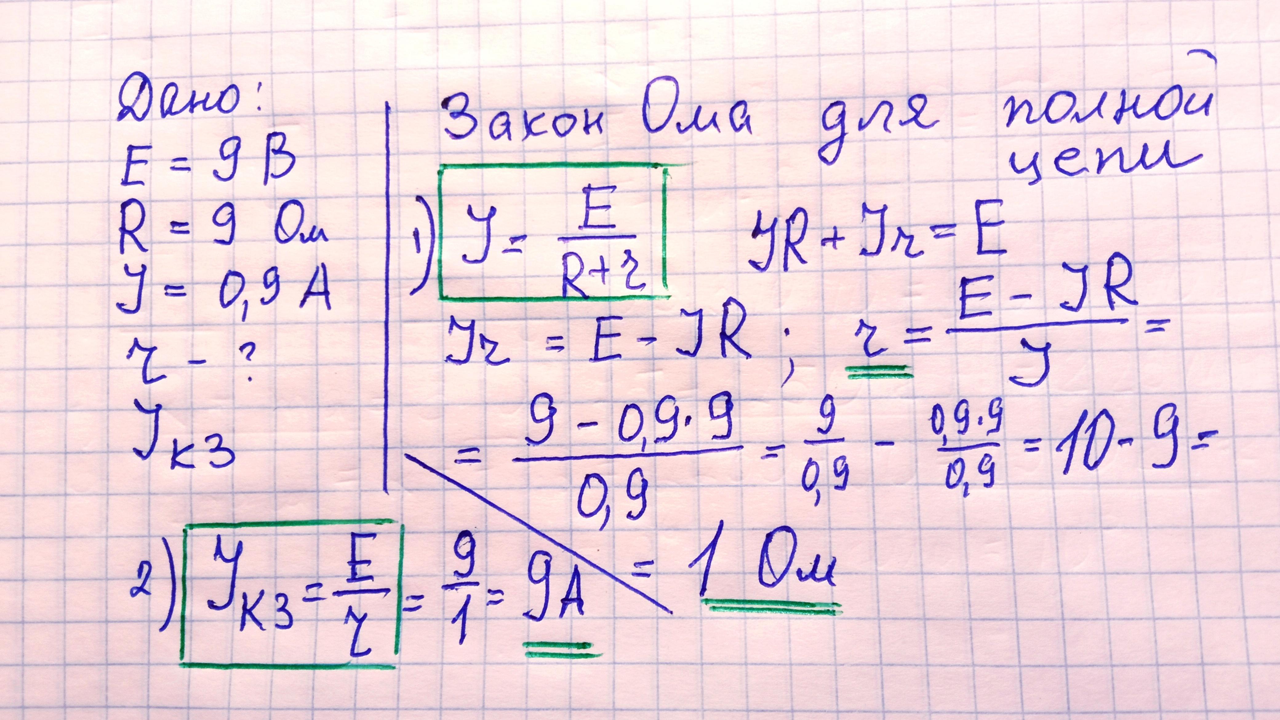 У колі що містить джерело струму з ЕРС 9В і провідник з опором 9 Ом,сила струму становить 0,9 А.Знайти внутрішній опір джерела і струму короткого замикання для нього.