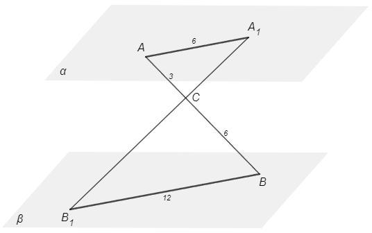 Точка С лежить між паралельними площинами a i b. Через точку C проведено прямі а і б, які перетинають площину a в точках А і А1, а площину b в точках В і В1 відповідно. Знайти АА1, якщо АС = 3 см, В1В - 12 см, АА1= СВ.
