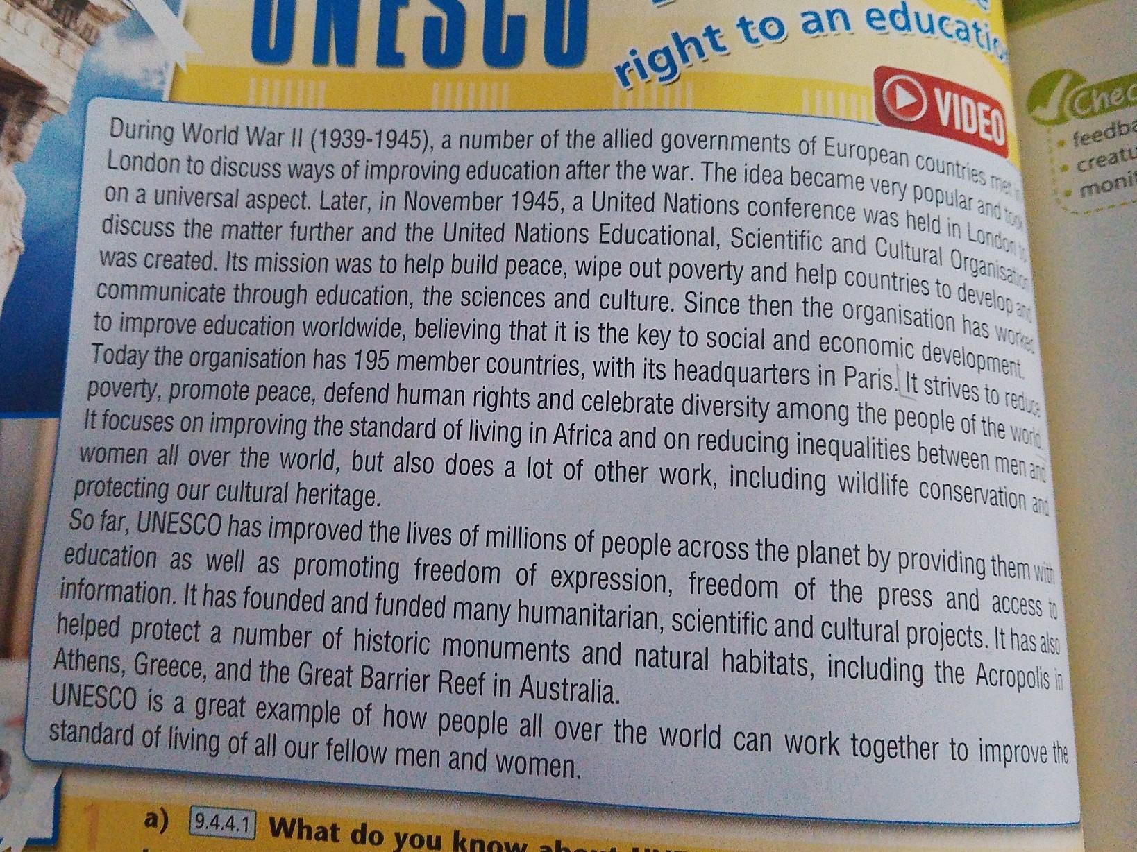 9.4.2.1 Read again and answer the questions. 1 Who created UNESCO? 2 Why was UNESCO created? 3 What are UNESCO's main objectives? 4 How does UNESCO protect cultural heritage? 5 For UNESCO, what is the key to human development?