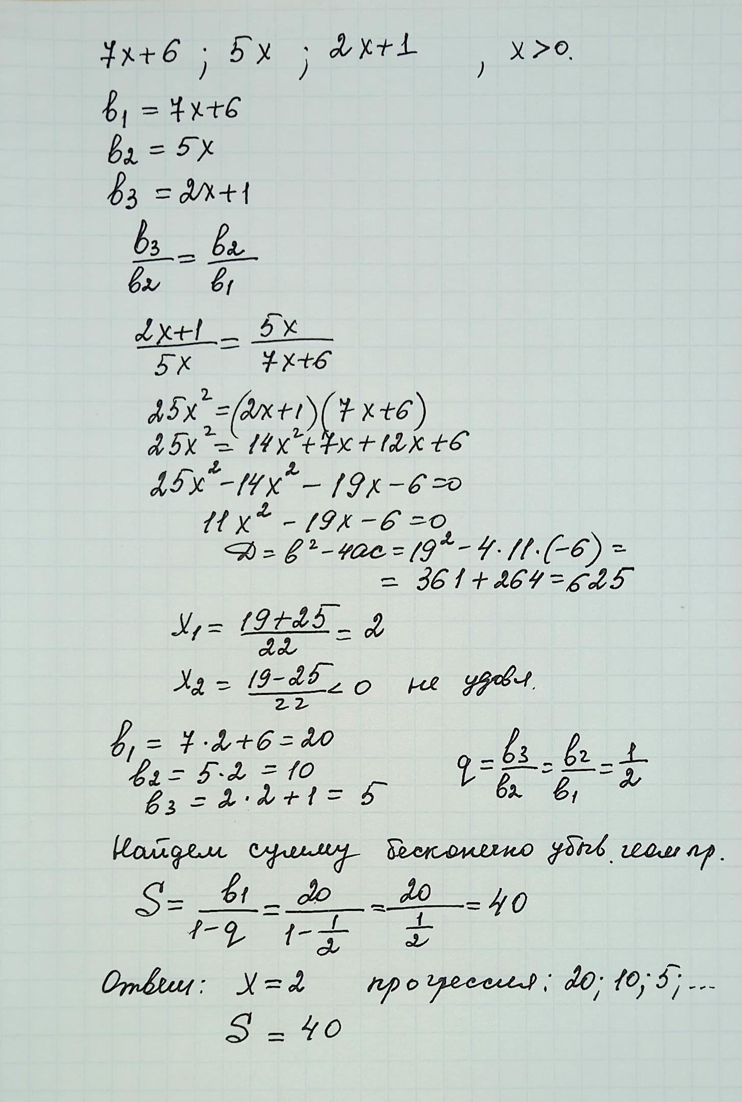 в геометрической прогрессии первый, второй и третий члены соответственно равны 7х+6 ; 5х и 2х+1 , где х положительное число.