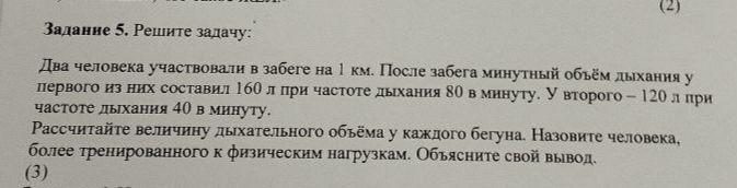 Задание 5. Решите задачу: Два человека участвовали в забеге на 1 км. После забега минутный объём дыхания у первого из них составил 160 л при частоте дыхания 80 в минуту. У второго - 120 л при частоте дыхания 40 в минуту. Рассчитайте величину дыхательного объёма у каждого бегуна. Назовите человека, более тренированного к физическим нагрузкам. Объясните свой вывод. (3)