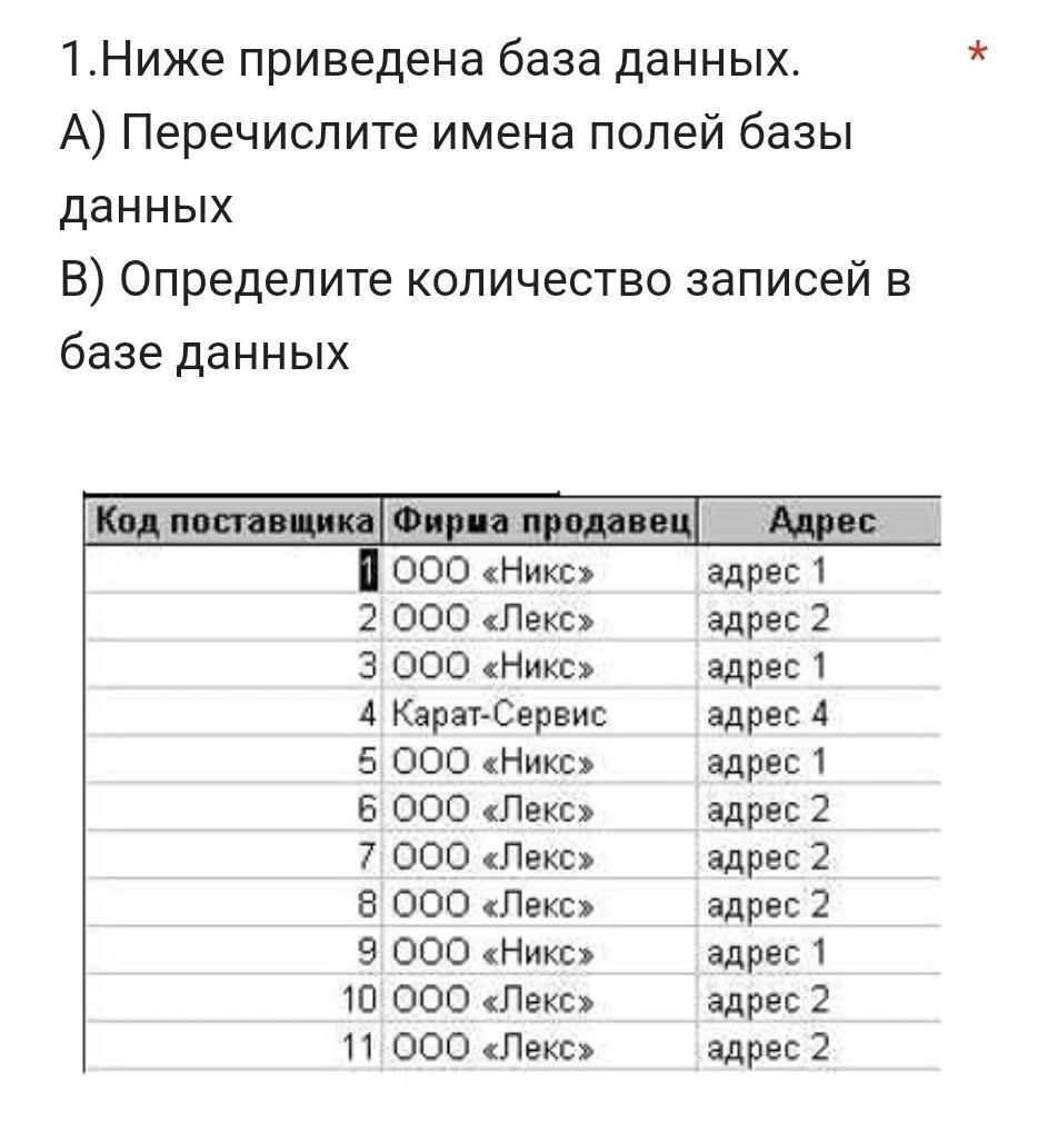 A) Имена полей базы данных: “Код поставщика”, “Фирма продавец”, “Адрес”. B) Количество записей в базе данных: 11.