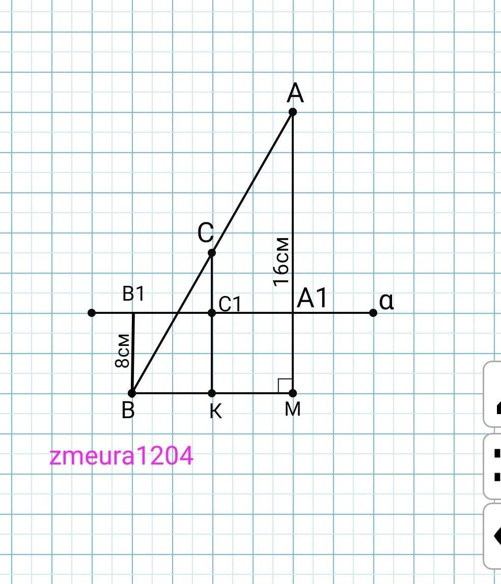 С проведено паралельні прямі, які перетинають площину α в точках А1, В1, С1 відповідно. Знайти довжину СС1, якщо АА1=16см; ВВ1=8см (У розв’язанні повинен бути рисунок, записана умова, докладний розв'язок,