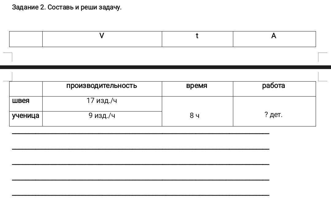 Задание 2. Составь и реши задачу. швея Ученица V производительность 17 Изд./ч 9 изд./ч t время 8 4 A работа ? дети. Пжжжжж даю 50 б объяснение