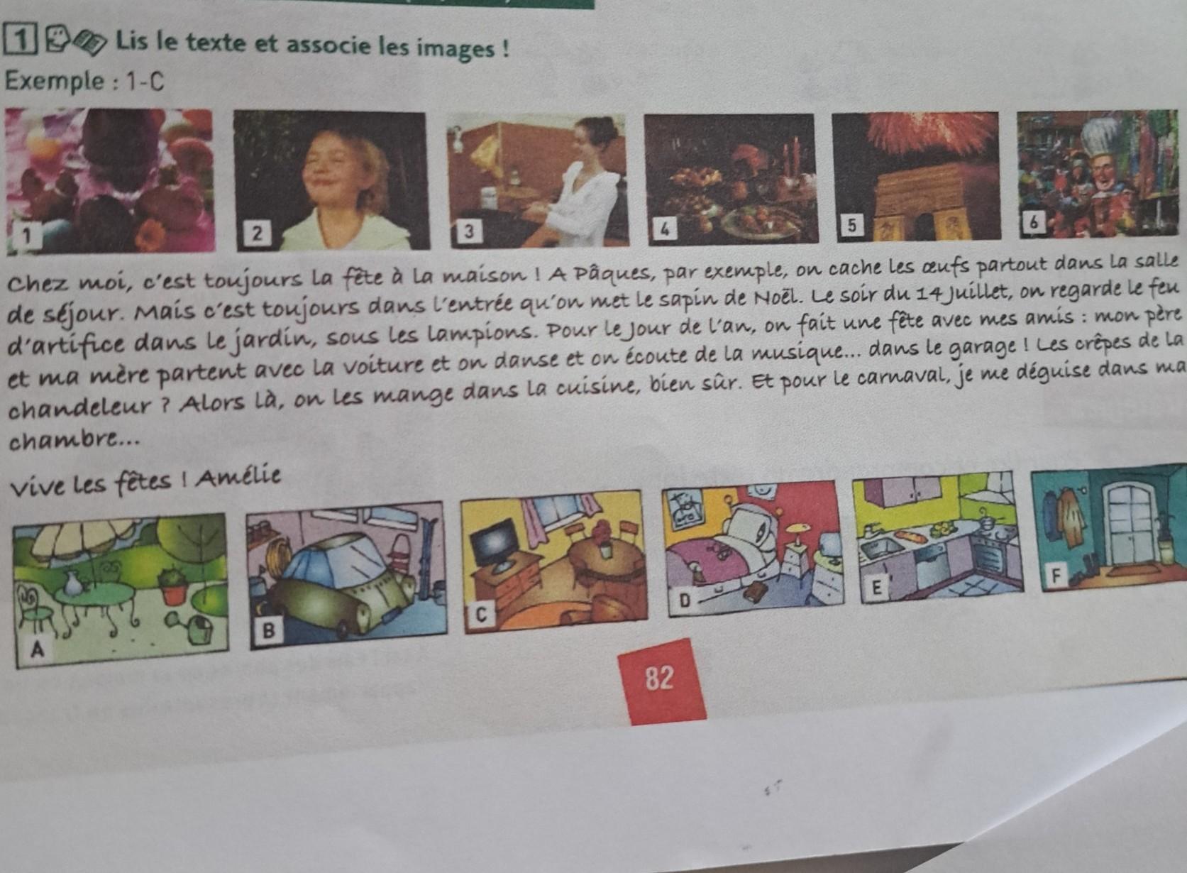 1 Lis le texte et associe les images ! Exemple : 1-C B 2 3 5 Chez moi, c'est toujours la fête à la maison ! A Pâques, par exemple, on cache les œufs partout dans la de séjour. Mais c'est toujours dans l'entrée qu'on met le sapin de Noël. Le soir du 14 juillet, on regarde d'artifice dans le jardin, sous les lampions. Pour le jour de l'an, on fait une fête avec mes amis: me et ma mère partent avec la voiture et on danse et on écoute de la musique... dans le garage ! Les crêpe chandeleur ? Alors là, on les mange dans la cuisine, bien sûr. Et pour le carnaval, je me déguise de chambre... vive les fêtes ! Amélie 4 C D 82 6 E F