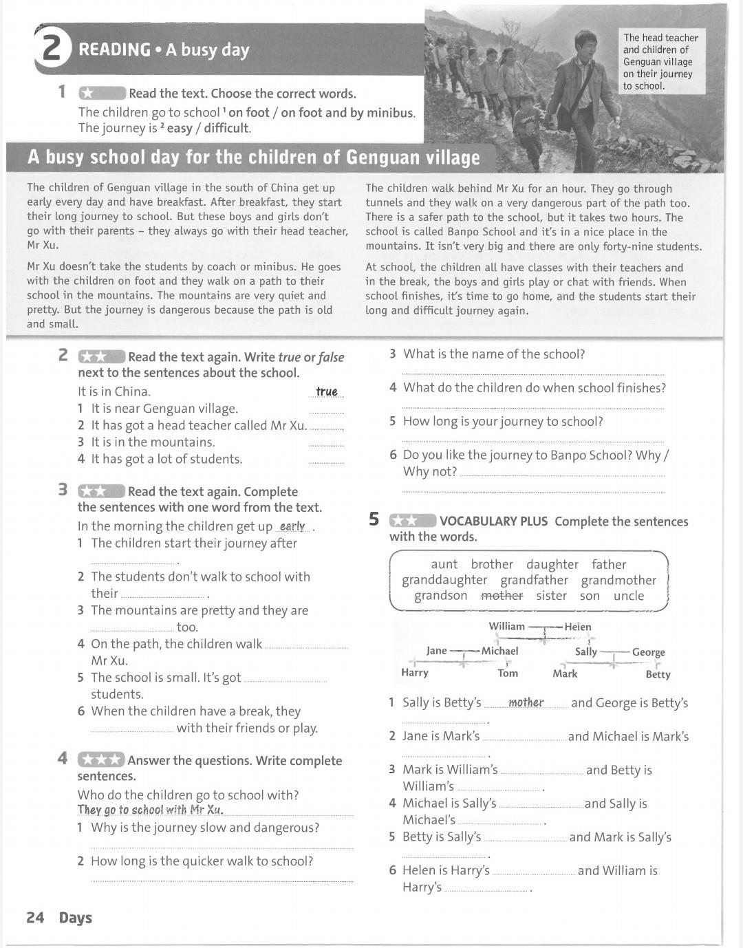2 READING A busy day 1 Read the text. Choose the correct words. The children go to school¹ on foot / on foot and by minibus. The journey is 2 easy / difficult. A busy school day for the children of Genguan village The children of Genguan village in the south of China get up early every day and have breakfast. After breakfast, they start their long journey to school. But these boys and girls don't go with their parents - they always go with their head teacher, Mr Xu. Mr Xu doesn't take the students by coach or minibus. He goes with the children on foot and they walk on a path to their school in the mountains. The mountains are very quiet and pretty. But the journey is dangerous because the path is old and small. 2 Read the text again. Write true or false next to the sentences about the school. It is in China. 1 It is near Genguan village. 2 It has got a head teacher called Mr Xu. 3 It is in the mountains. 4 It has got a lot of students. 3 * Read the text again. Complete the sentences with one word from the text. In the morning the children get up early. 1 The children start their journey after 2 The students don't walk to school with their 3 The mountains are pretty and they are too. true 4 On the path, the children walk. Mr Xu. 5 The school is small. It's got. students. 6 When the children have a break, they with their friends or play. 4 Answer the questions. Write complete sentences. Who do the children go to school with? They go to school with Mr Xu. 1 Why is the journey slow and dangerous? 2 How long is the quicker walk to school? The children walk behind Mr Xu for an hour. They go through tunnels and they walk on a very dangerous part of the path too. There is a safer path to the school, but it takes two hours. The school is called Banpo School and it's in a nice place in the mountains. It isn't very big and there are only forty-nine students. At school, the children all have classes with their teachers and in the break, the boys and girls play or chat with friends. When school finishes, it's time to go home, and the students start their long and difficult journey again. 3 What is the name of the school? 4 What do the children do when school finishes? 5 How long is your journey to school? 6 Do you like the journey to Banpo School? Why / Why not? 5 * VOCABULARY PLUS Complete the sentences with the words. aunt brother daughter father granddaughter grandfather grandmother grandson mother sister son uncle Jane William Michael Tom Harry 1 Sally is Betty's 2 Jane is Mark's The head teacher and children of Genguan village on their journey to school. 3 Mark is William's William's 4 Michael is Sally's. Michael's 5 Betty is Sally's 6 Helen is Harry's. Harry's mother Helen Sally Mark George r Betty and George is Betty's and Michael is Mark's and Betty is and Sally is and Mark is Sally's and William is