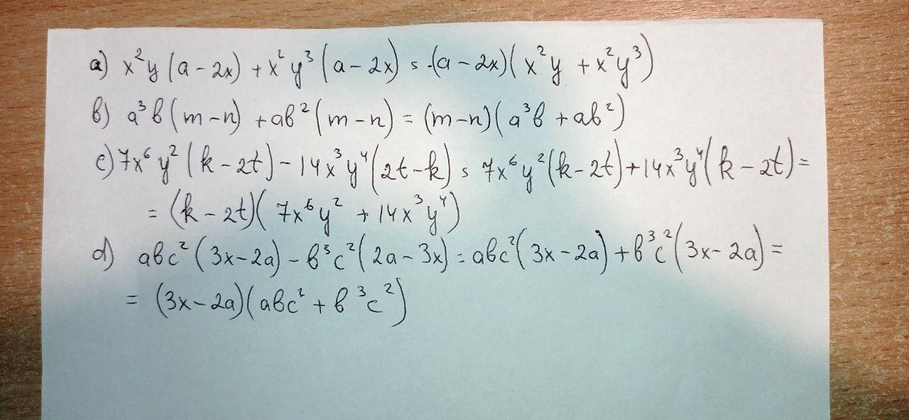в виде произведения: 5. Запишите выражения a) x²y(a - 2x) + x²y³(a - 2x); - b) a³b(m - n) + ab²(m - n); c) 7x®y²(k - 2t) – 14x³y^(2t - k); d) abc²(3x - 2a) - b³c²(2a - 3x).