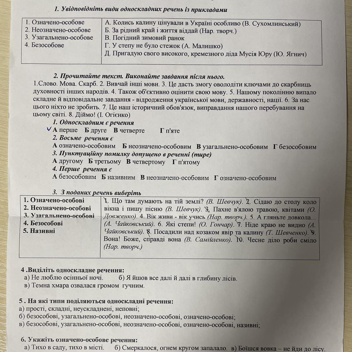 6) На які типи поділяються односкладні речення: а) прості, складні, неускладнені, неповні;