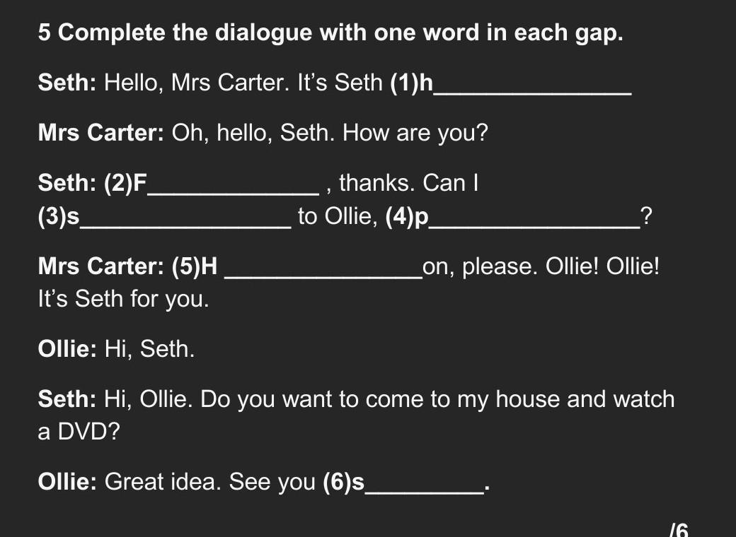 (1) here (2) Fine (3) speak (4) please (5) Hold (6) soon