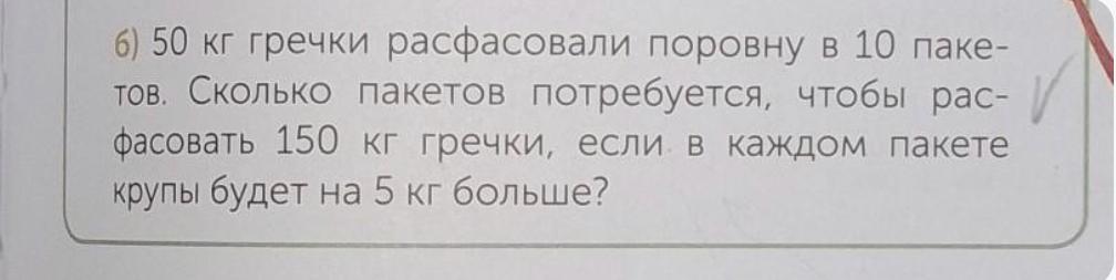 6) 50 кг гречки расфасовали поровну в 10 паке- тов. Сколько пакетов потребуется, чтобы рас- фасовать 150 кг гречки, если в каждом пакете крупы будет на 5 кг больше?